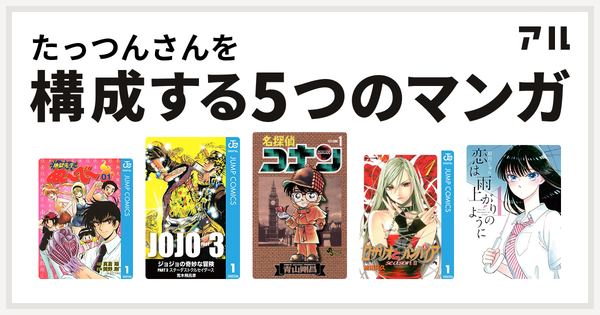 たっつんさんを構成するマンガは地獄先生ぬ べ ジョジョの奇妙な冒険 第3部 名探偵コナン ロザリオとバンパイア Season Ii 恋は雨上がりのように 私を構成する5つのマンガ アル